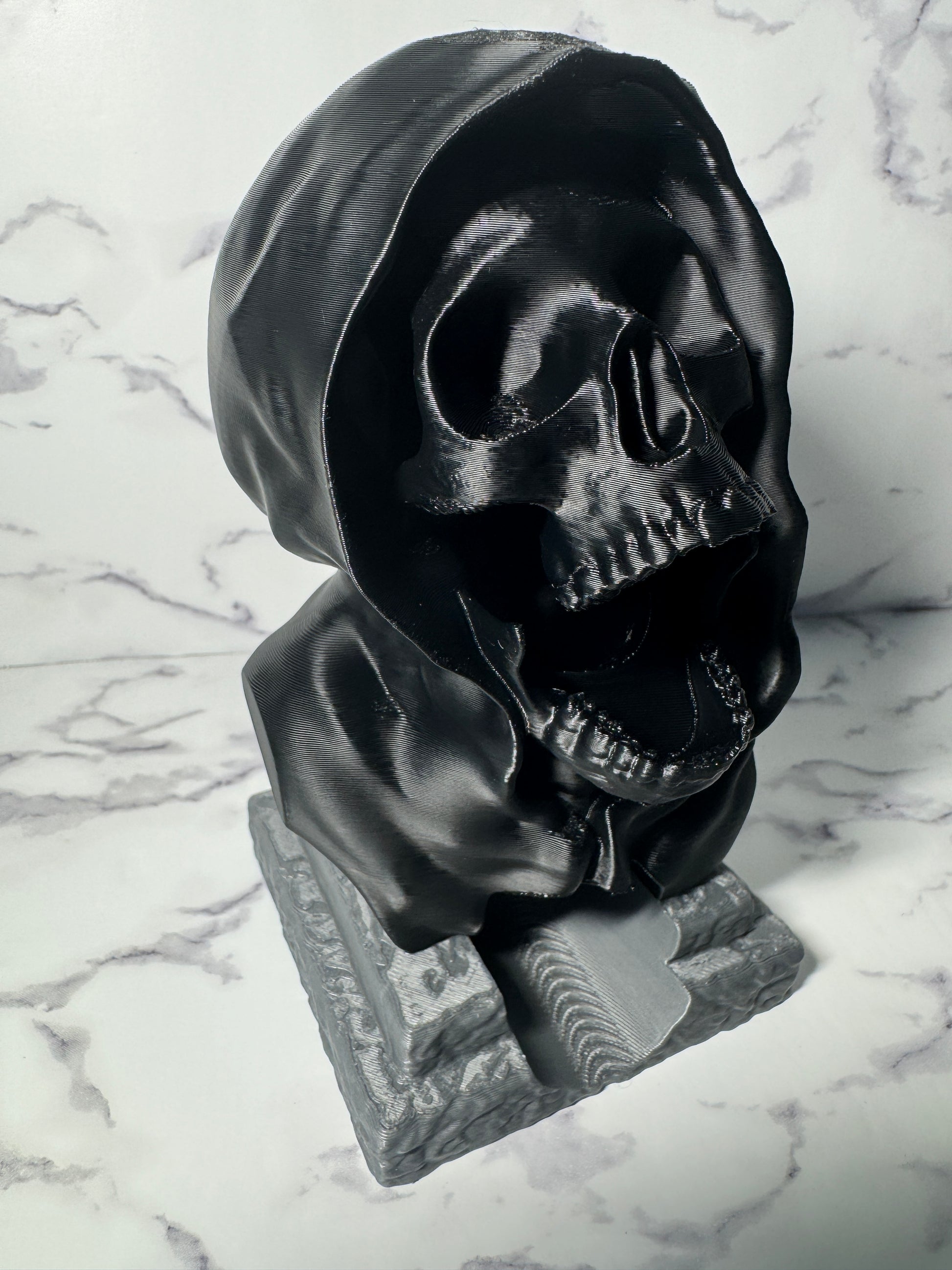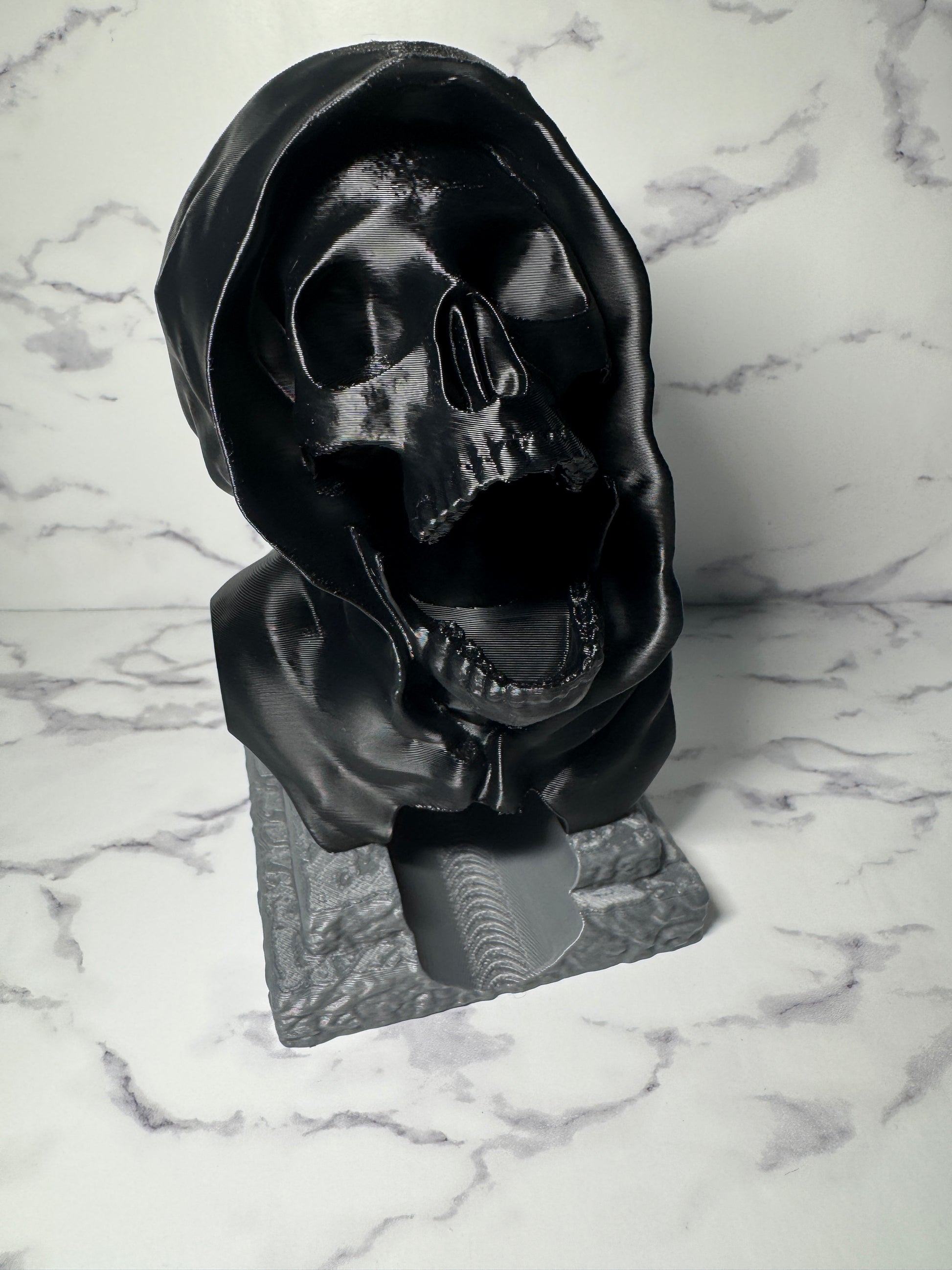 Bring dark-fantasy vibes to your table with this Hooded Skull Dice Tower. Drop your dice into the top and watch them tumble through the hidden interior path before rolling out the front—dramatic, clean rolls with a seriously spooky aesthetic.