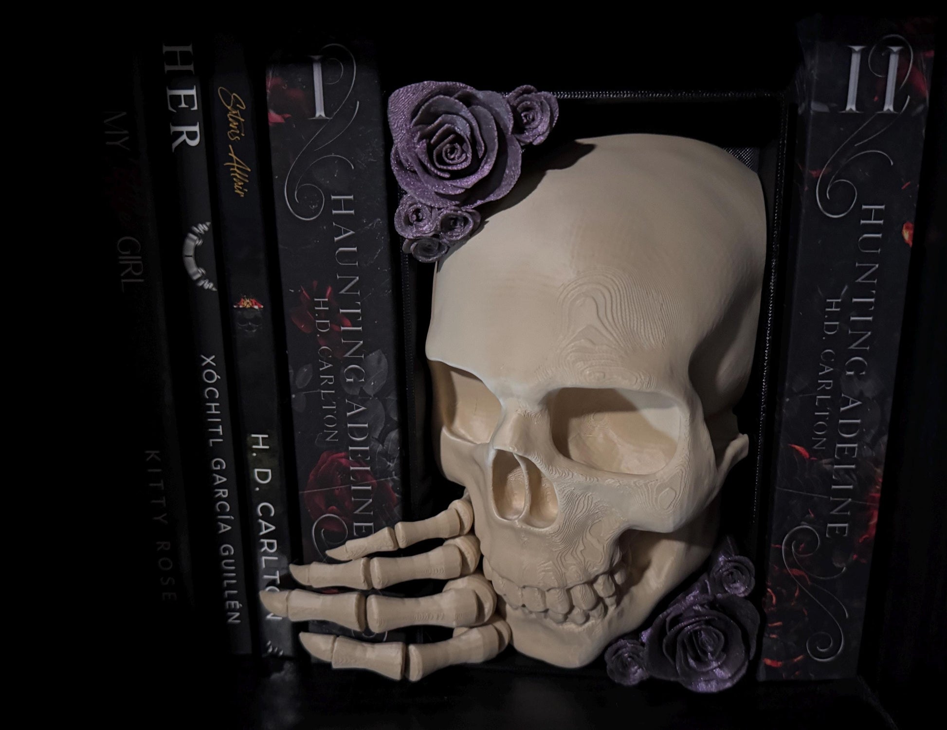 Gothic Skull Book Nook #1 | 3D Printed Bookshelf Insert with Skeleton Hand & Roses