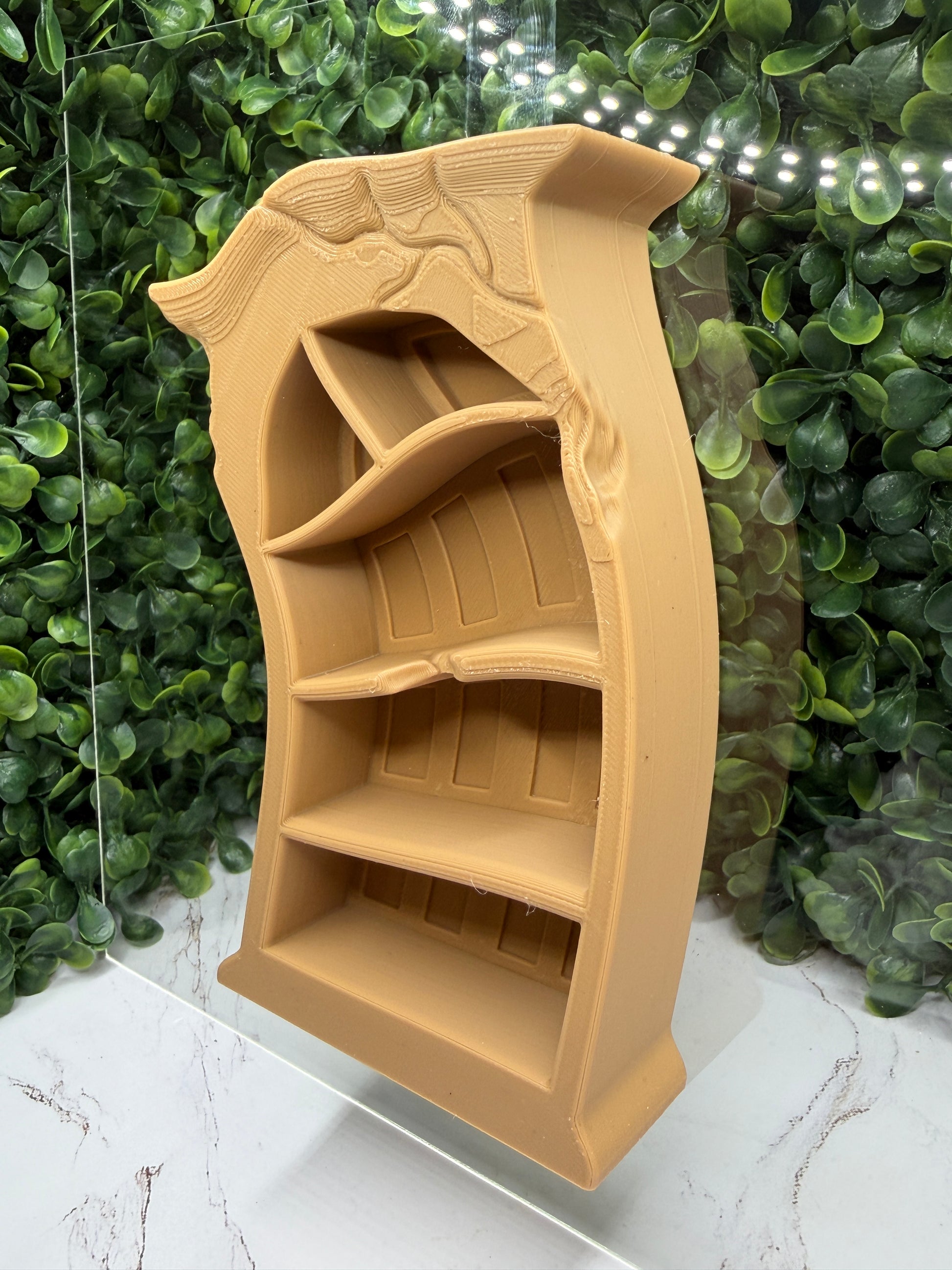 This bookshelf can be left simple on its own or customized with miniatures to match your enclosure style. Add tiny books, plants, potion bottles, skulls, candles, or other small decor pieces and glue them in place to create your own one-of-a-kind display.
